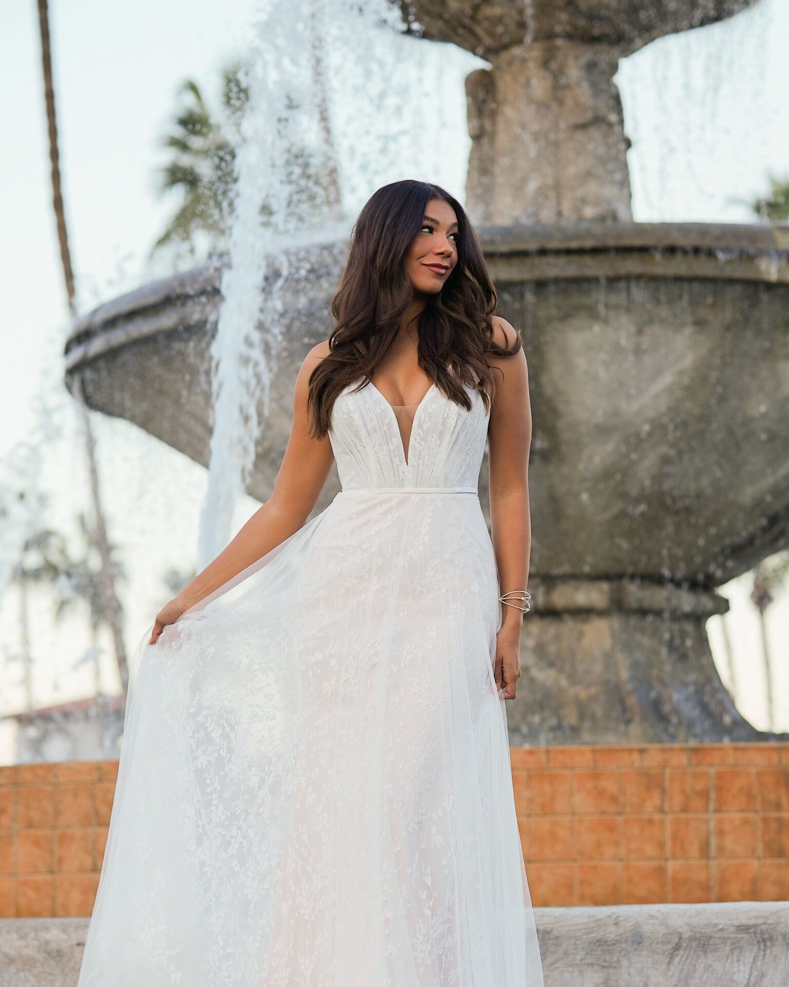 This gorgeous dress combines romantic lace and soft glitter tulle to bring together a glamourous and ethereal look. This dress featres a plunging, neckline on the strcutred bodice that shows off just enough skin for a sexy and confident feel!