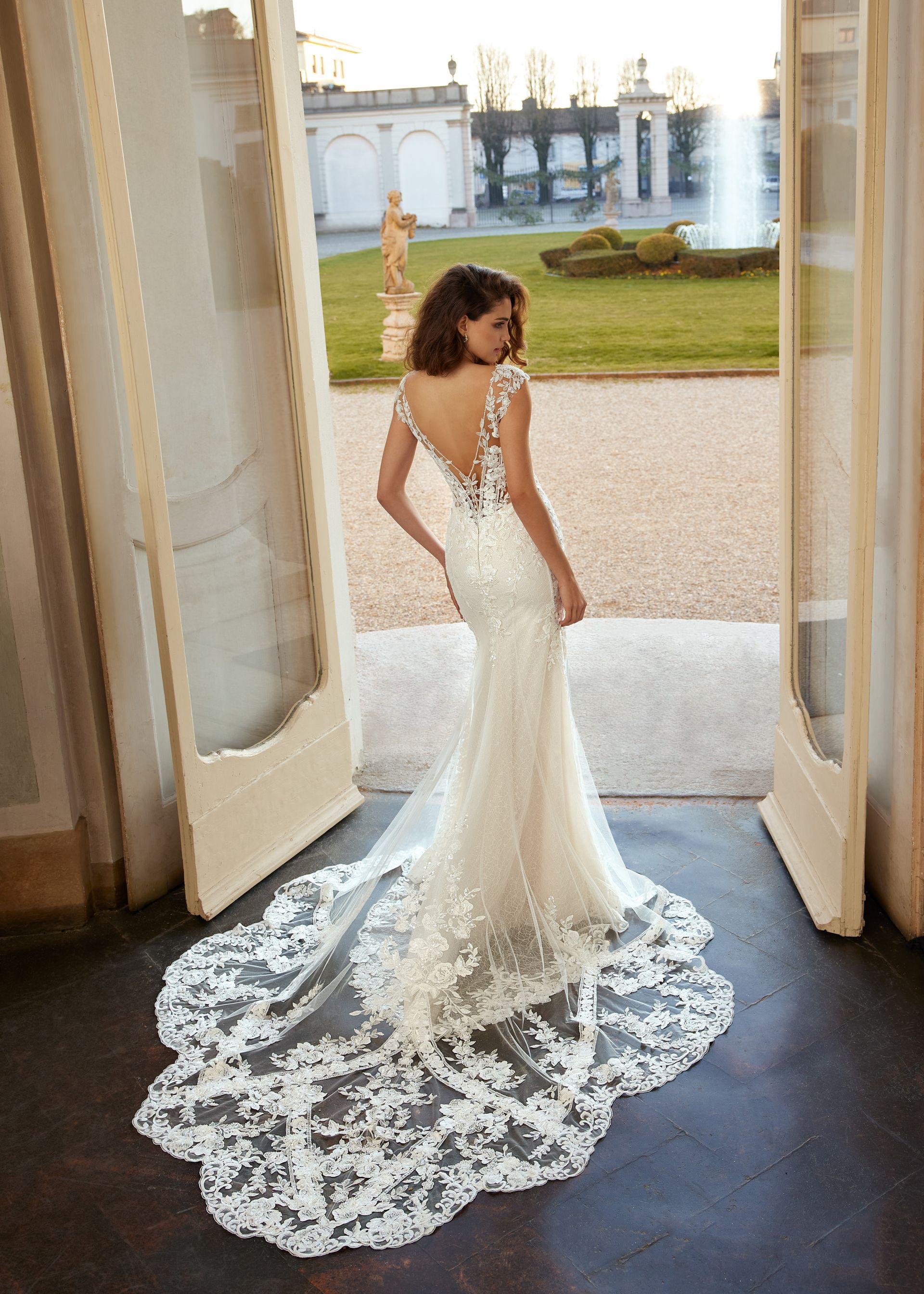 True elegance is achieved when brides wear Deedee. The beautiful and intricate lace on begins on the bodice and follows flattering lines down the mermaid skirt. The dress also features beautiful lace off-shoulder sleeves that can be removed to transform the look. And look at that train!