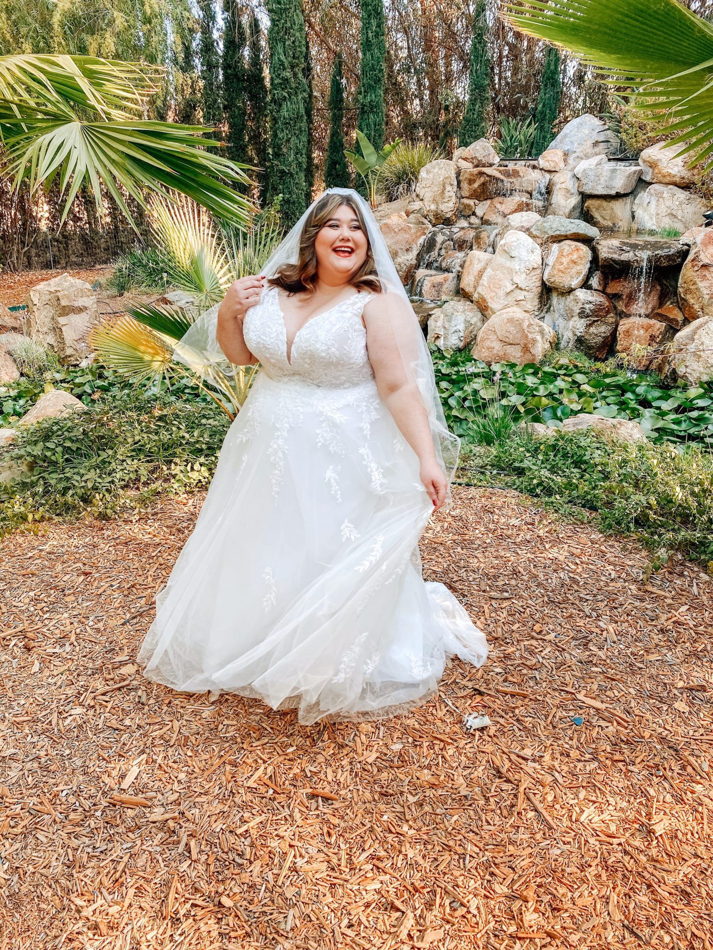 A stunning boho - meets - princess A-line gown with delicate tulle covered lace.